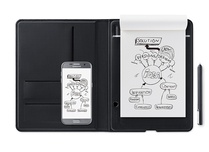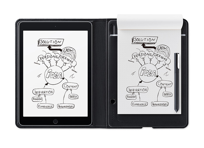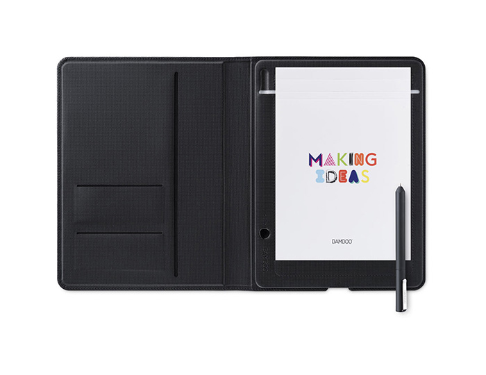 Bamboo Slate is a smartpad that allows you to write naturally with pen on any paper, and with the push of a button convert your handwritten notes into “living” digital files. With the Wacom Inkspace app you can organize, edit, and share your notes and sketches on your iOS or Android Bluetooth® enabled smart phone or tablet. Don’t worry if you’re not near your mobile device – you can store up to 100 pages on your Bamboo Slate and sync later.