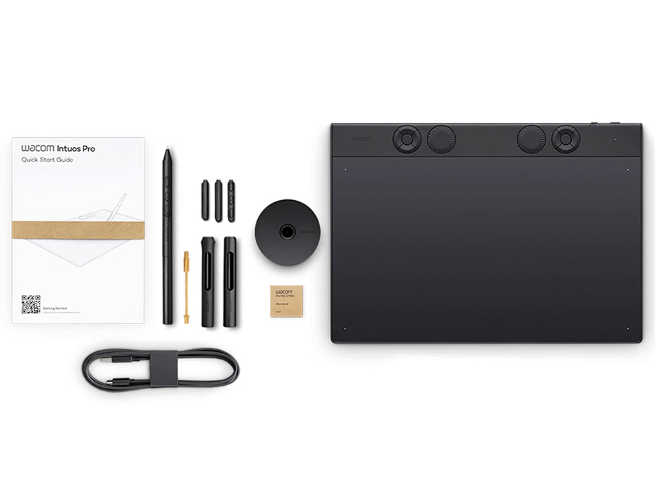 - Bảng vẽ Intuos Pro (2025) đi kèm với bút Wacom Pro Pen 3, đế cắm bút và 04 ngòi tiêu chuẩn, 03 ngòi nỉ, 02 ngòi cao su mới.