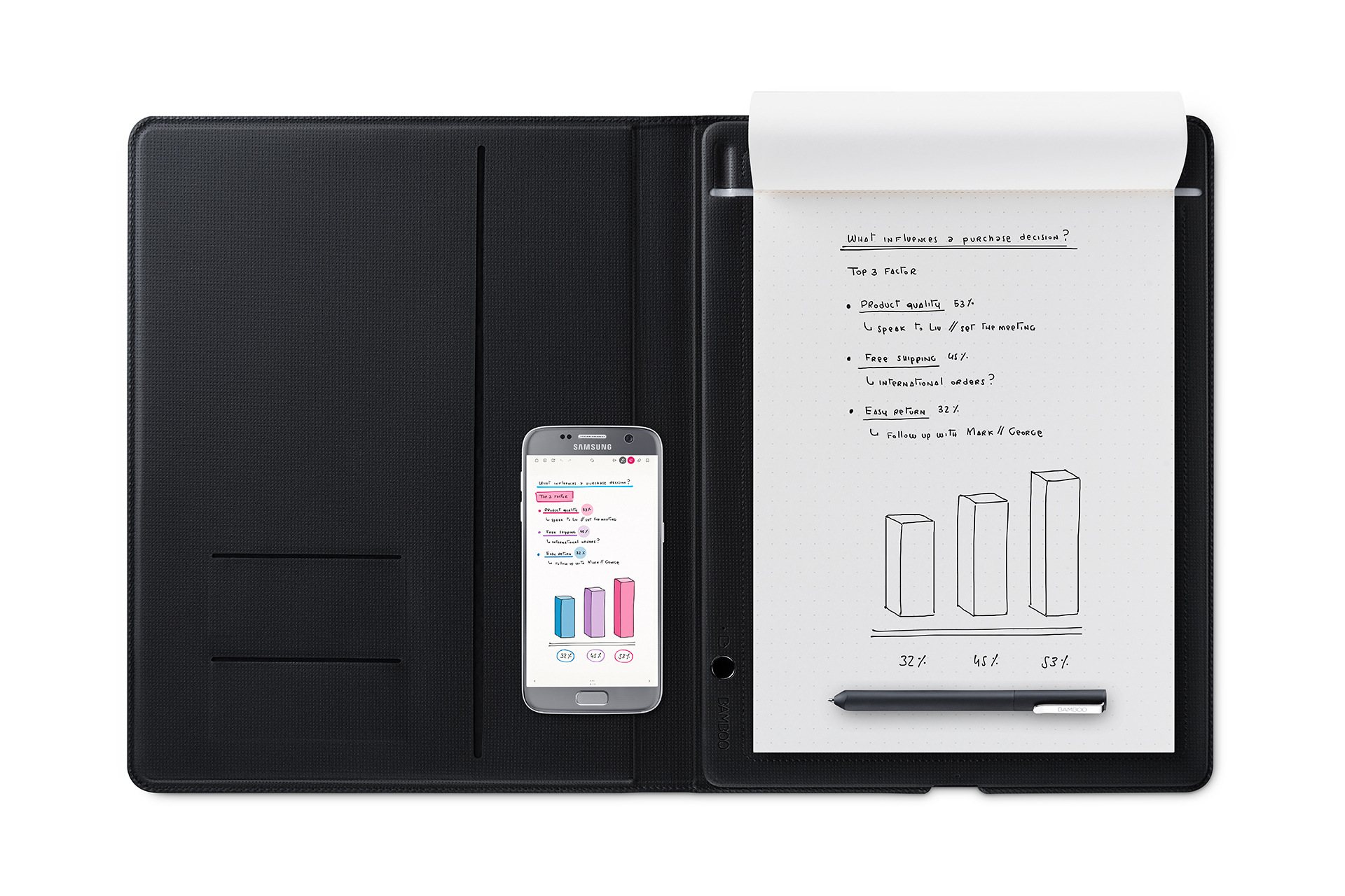 - What's IncludedBamboo Folio, pen with one extra refill, notepad, micro USB cable, quick start guide (smartphone and tablet not included)