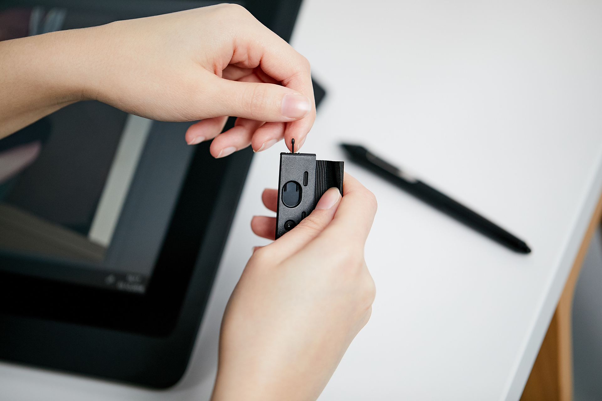 - Giá gắn bútĐồ giắt bút bên hông màn hình có thể tháo rời, đi kèm 3 ngòi dự phòng thay thế (ngòi tiêu chuẩn) và dụng cụ tháo ngòi