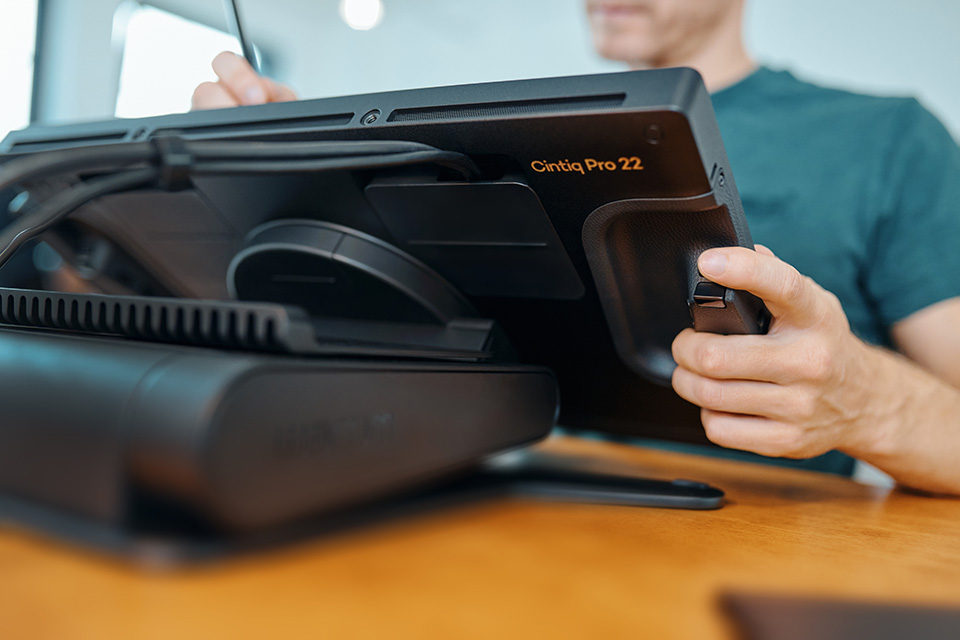 - Chân đế tương thíchChân đế Wacom Cintiq Pro 22 (tuỳ chọn) hỗ trợ nghiêng, nâng và xoay;